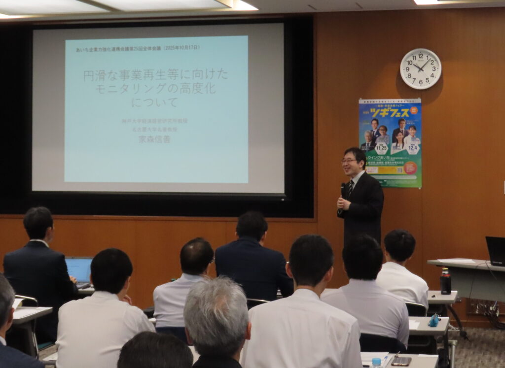 全体会議では、はじめに、神戸大学経済経営究所教授・名古屋大学名誉教授 家森 信善氏による「円滑な事業再生等に向けたモニタリングの高度化について」をテーマとした講演が行われ、中小企業庁が設置した「円滑な事業再生等に向けたモニタリングの高度化に関する研究会」が令和7年3月に公表した報告書に基づくお話をいただきました。
